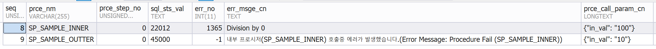 DECLARE v_proc_name varchar(100) DEFAULT 'SP_SAMPLE_OUTTER'; #프로시져 이름