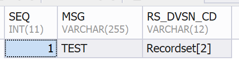 하위 SP에서 테이블 조회 데이터를 JSON_OBJECT 함수를 이용하여 JSON 포맷으로 변환하여 OUT 변수(out_val2)에 값을 할당하여 호출자에게 전달(v_rlt_out2) 처리한다.