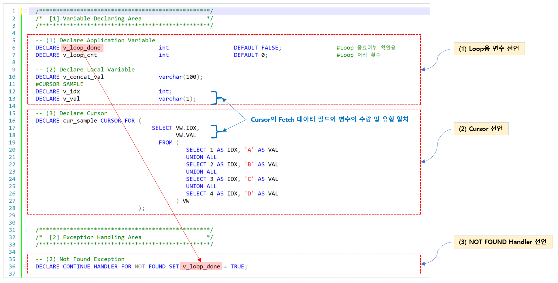 SET v_loop_done := FALSE; #Loop문 내에서 SELECT문 결과가 없는 경우도 Not found exception이 TRUE로 발생하여 초기화 처리 필요