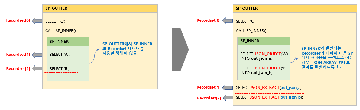 왜냐하면 SP에서 SELECT 구문에 의한 Recordset[n] 형태의 반환 결과는 다른 SP에서 호출하여 사용할 방법이 없기 때문이며, 하위 SP에서 반환된 Recordset은 상위 SP를 통해서 외부 Application으로 바로 전달된다. 한편으로는 편리하기도 하지만 SP의 재사용성의 측면에서는 제약점이기도 하다. 이러한 점 때문에 정책적으로 SP의 반환 결과는 OUT 변수 또는 임시 테이블을 통해 반환하는 방식으로 결정한다면, 외부 Application과 데이터를 주고받는 그룹과 내부적으로 재사용을 위한 그룹으로 분리하여 개발/관리 되어야 하는 번거러움이 발생하기도 한다.